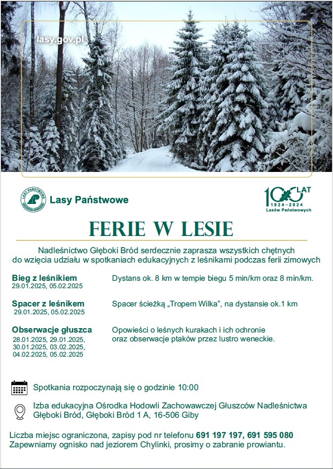 Ferie zimowe w Nadleśnictwie Głęboki Bród zapowiadają się bardzo interesująco. Będzie sportowo i edukacyjnie. Zapraszamy!