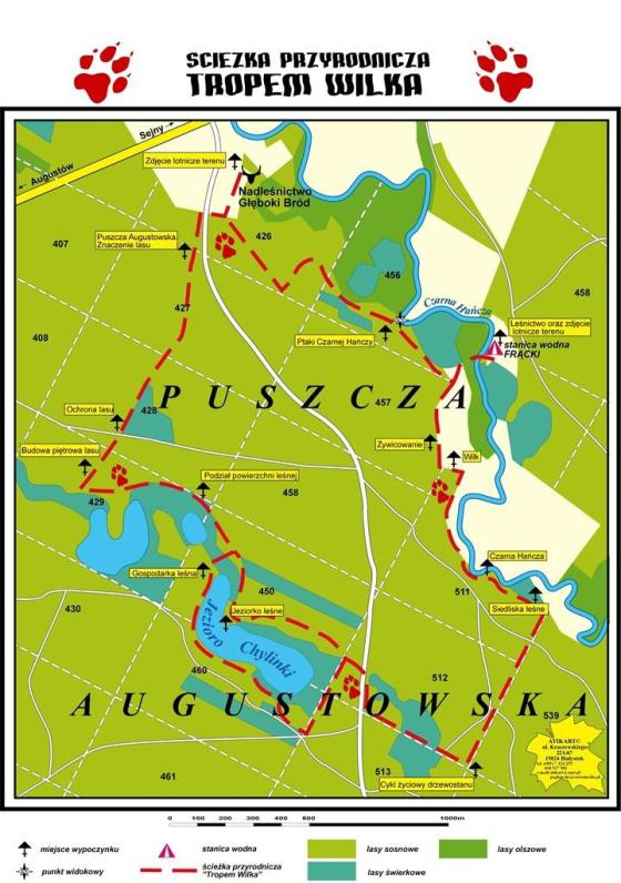 Ścieżka o długości około 8 km, czas przejścia ocenia się na około 4. Poprowadzą nas tutaj wymalowane na całej długości ścieżki, czerwone tropy wilka. Spacer ścieżką można zacząć przy siedzibie nadleśnictwa lub ze Stanicy Wodnej we Frąckach, po przejściu przez bród na Czarnej Hańczy. Poruszając się wilczym tropem zamkniemy pętlę w tym samym miejscu, z którego rozpoczęliśmy podróż.